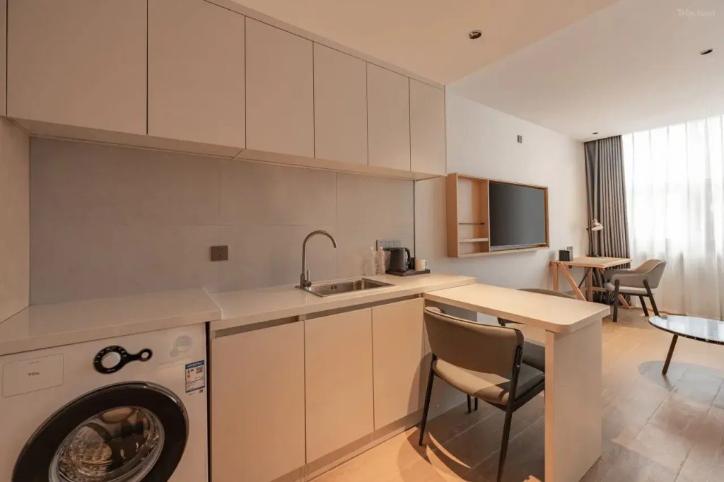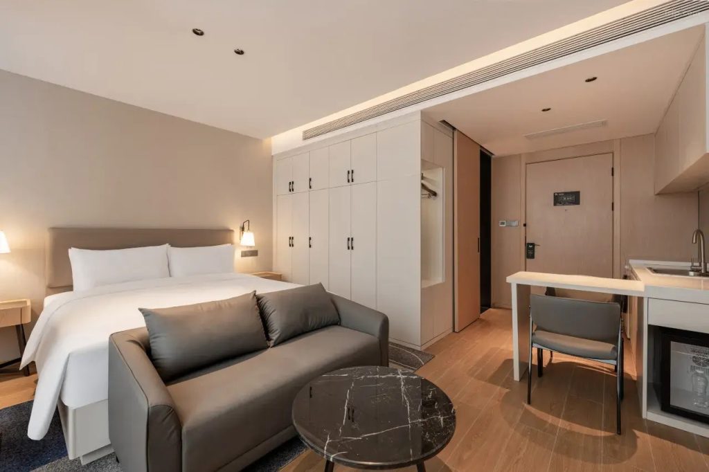 ● 长期居住:酒店专门打造了公寓楼层,一居、两居共四种房型可选,每间都配洗衣机、冰箱、水吧,部分还带集成灶,把家的便利与酒店的质感完美结合,长住也温馨又体面。