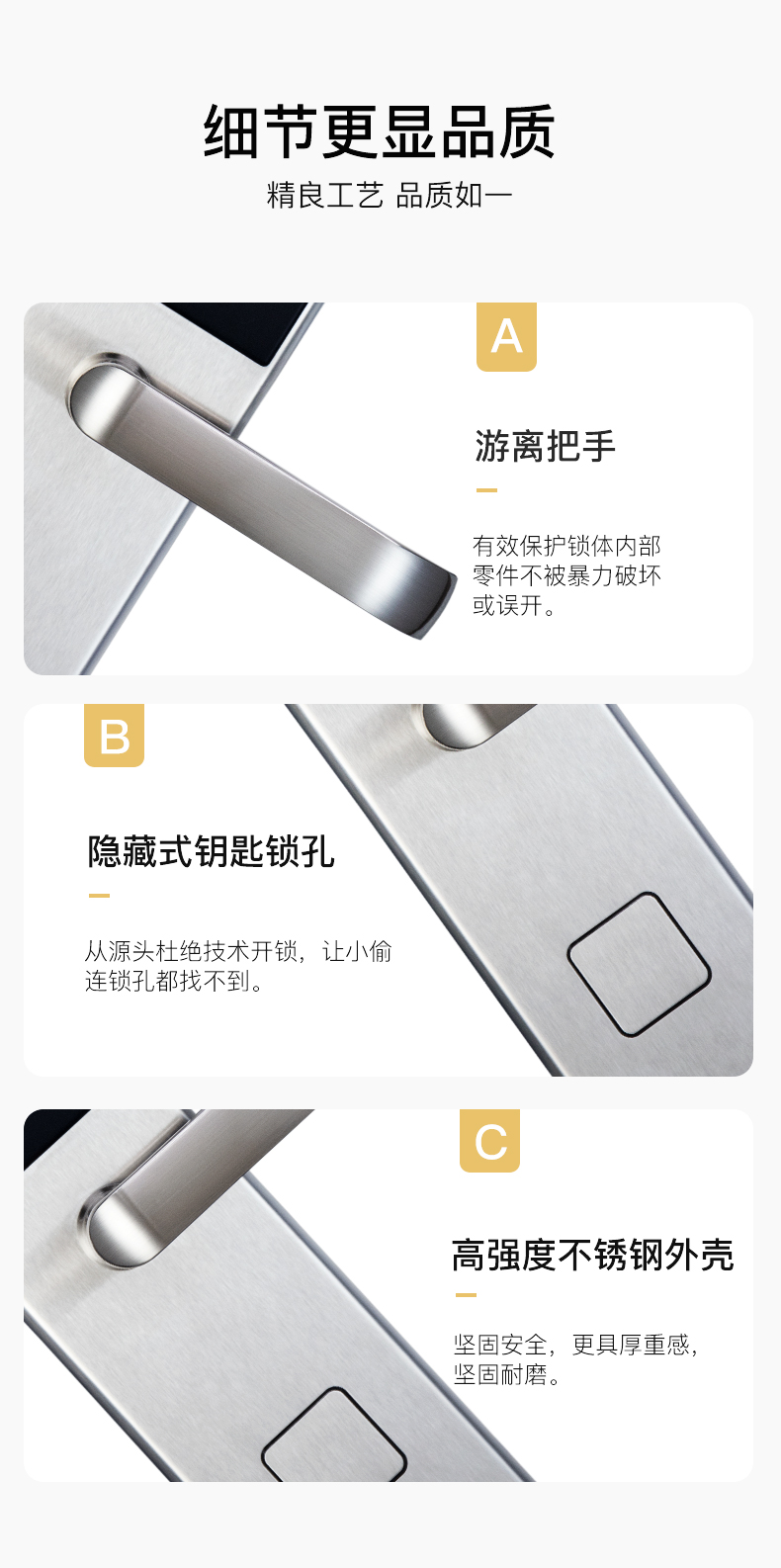 不锈钢酒店门锁,以其坚固的身躯和耐腐蚀的肌肤,为酒店的每一个角落带来安全与优雅的守护,让每一次的进出都成为一场视觉与触感的盛宴。