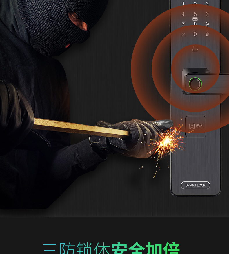 杨格智能锁采用圆形凹槽设计,大面积指纹识别去,一次性获取更多指纹信息,迅速开锁,安全可靠。