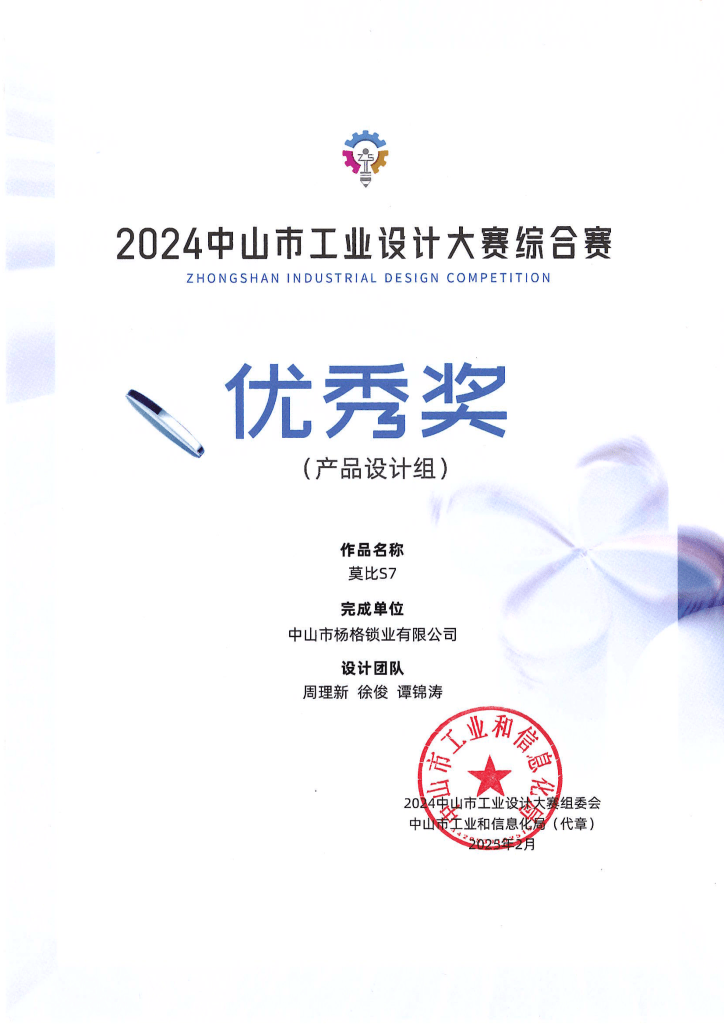 12月21日,随着2024中山市工业设计大赛综合赛终评的落幕,经专家组评审和公示,杨格锁艺术酒店门锁莫比S7 凭借其卓异精美的外观设计,以及极具开创性和实用性的功能突破革新,荣获“中山市工业设计大赛优秀奖”。